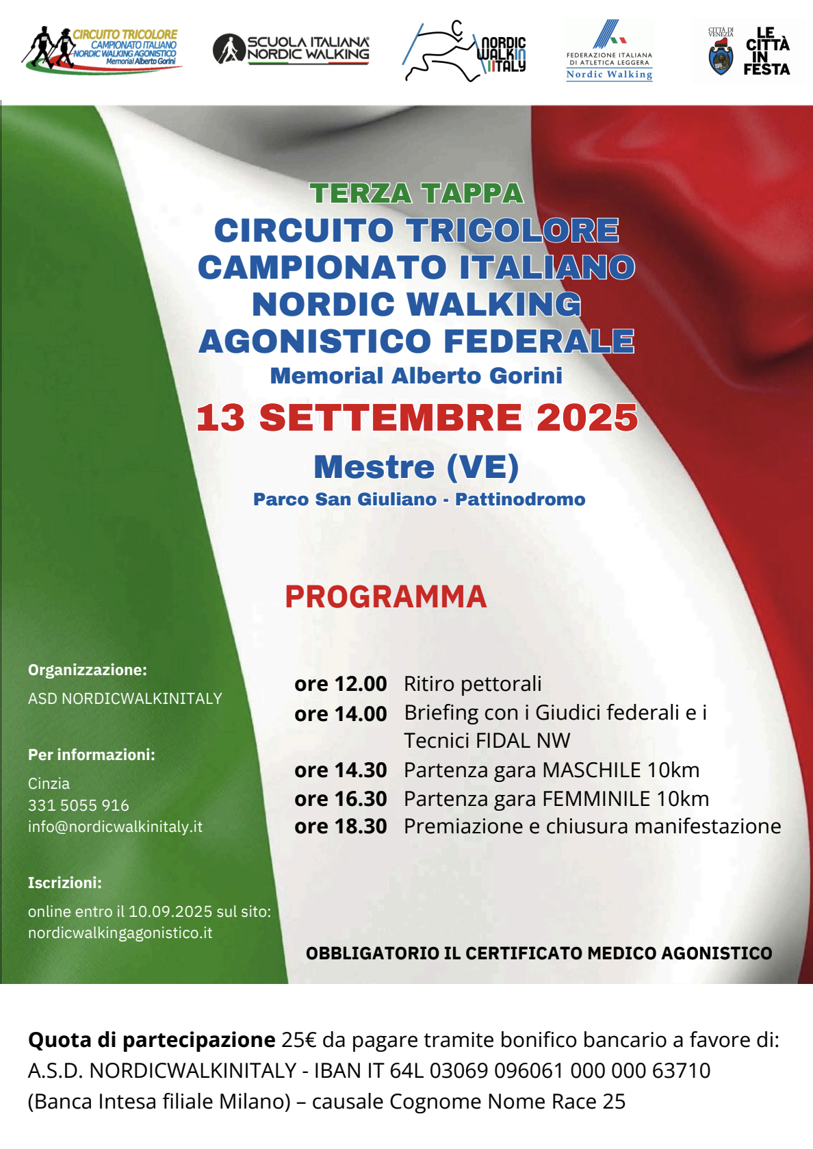 Torna l’appuntamento annuale a Mestre, presso il Parco di San Giuliano – Pattinodromo, per la 3° e conclusiva Tappa del Campionato Italiano 10 Km di Nordic Walking agonistico, che si svolgerà